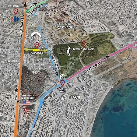 Kuzey Afrika Amerikan Mezarlığı ve Anıtı, Luxury And Art Contemporary With Masterpieces Daire dairesine 4 km uzaklıktadır. Ain Zaghouane otobüs durağı 10 dakikalık yürüme mesafesindedir. St. Louis Katedrali, daireye yaklaşık 3 km ve Tunus-Kartaca Uluslararasi Havalimani havaalanına 5 km uzaklıktadır. Le Triplex, Italiaanse mutfağından yemekleri sunmakta ve 13 dakikada ulaşılabilir. Antik Roma Hamamları'dan kısa bir sürüş mesafesindedir.